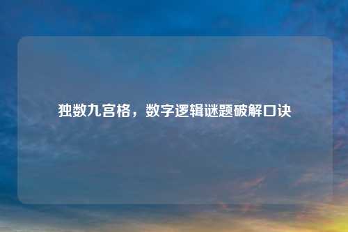 独数九宫格是数字世界里极具魅力的逻辑谜题,它以独特的数字排列和逻辑推理吸引着众多谜题爱好者,在破解独数九宫格时,有相应的口诀可遵循,这些口诀能帮助解题者更高效、准确地完成谜题挑战,通过利用口诀,人们能更清晰地把握数字间的关系,在九宫格的数字迷宫中找到破题点,感受逻辑推理带来的乐趣,享受一步步解开谜题的成就感,深入领略独数九宫格的独特魅力。